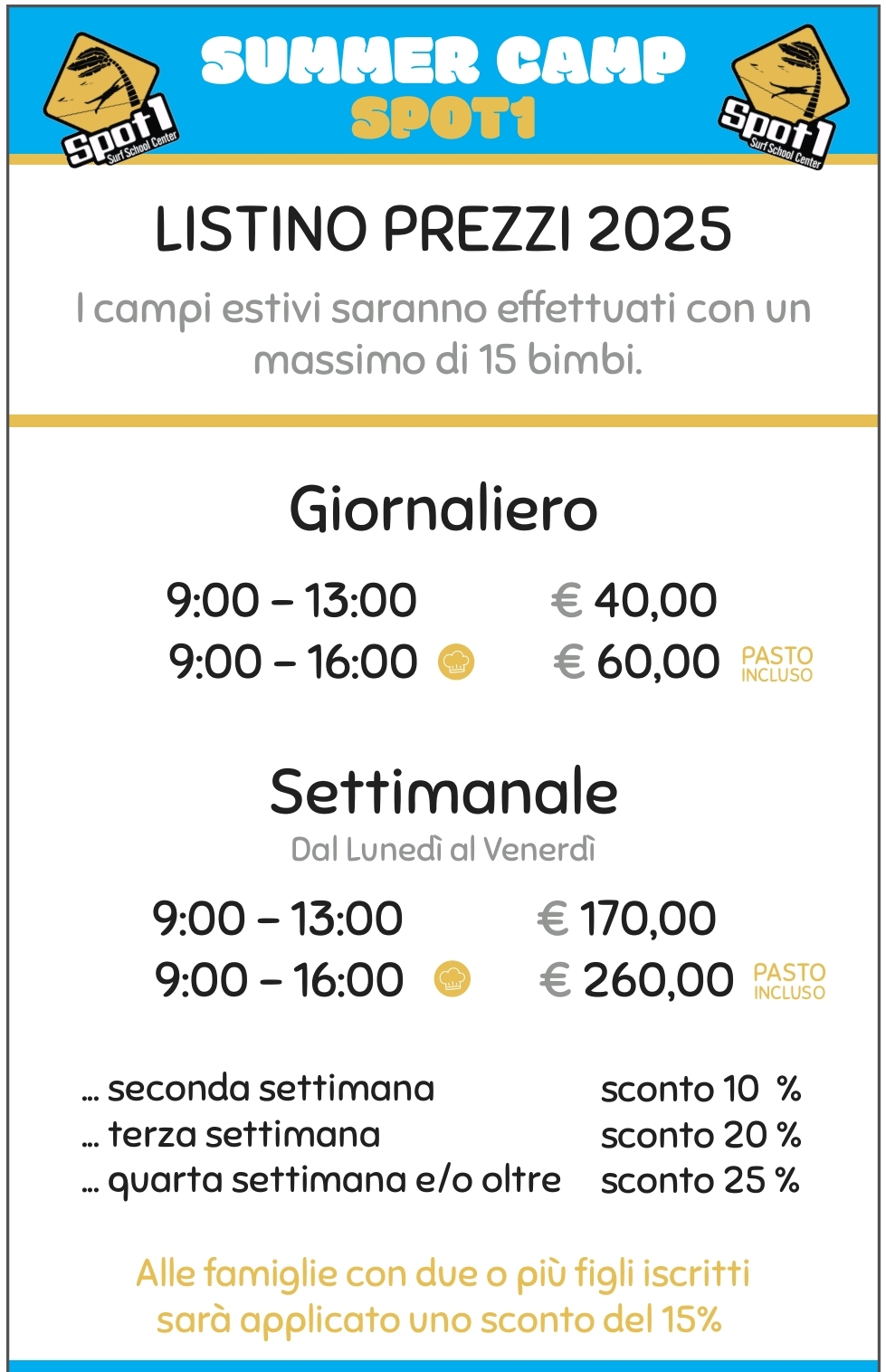 I pacchetti settimanali sono soggetti a sconto come da listino prezzi che segue, inoltre per le famiglie con più di un bambino iscritto sarà applicato un ulteriore sconto del 15%.